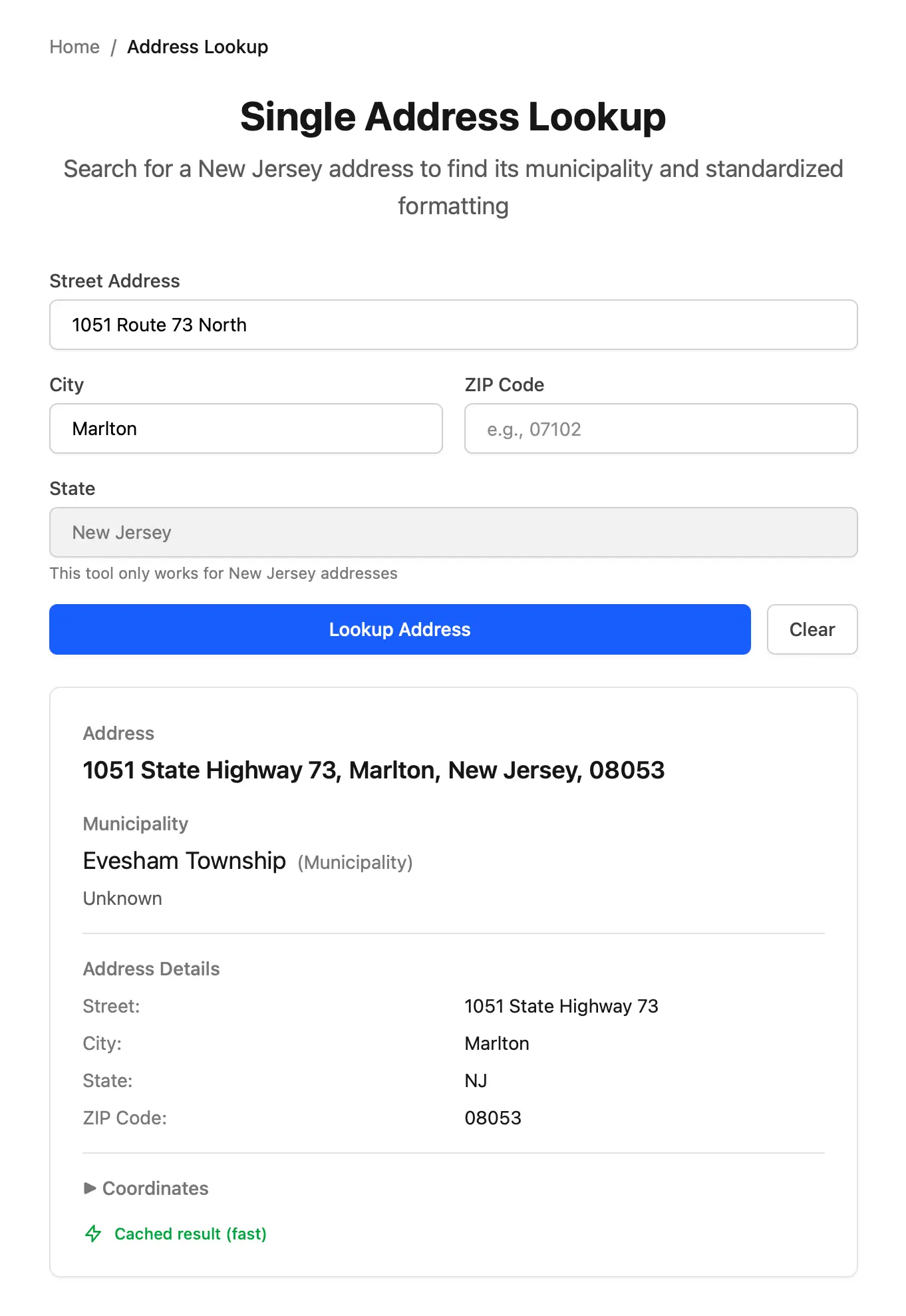 Government agencies need accurate municipality data for routing services, processing applications, and maintaining records. Addresses can be entered in various formats, and manual municipality lookup is error-prone and time-consuming. This application automates the process while demonstrating software architecture best practices that can be reused across other New Jersey government applications.